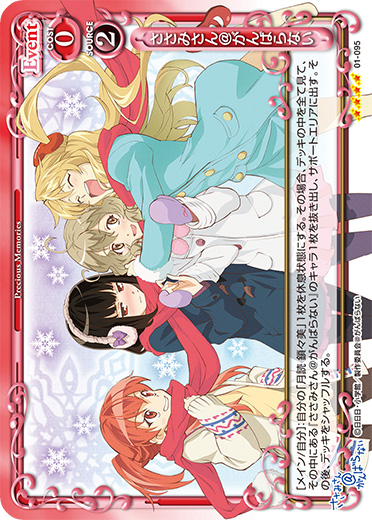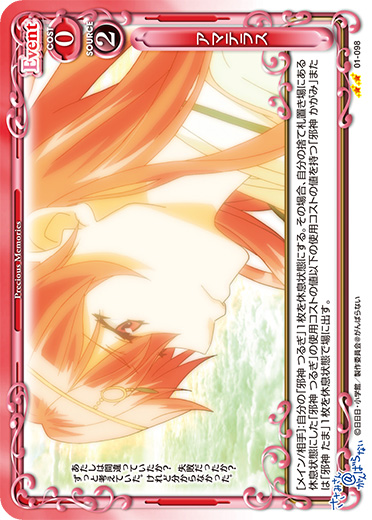 | 《使用条件》:「月読 鎖々美」[メイン/自分]:カードを2枚引く。その場合、このターン、自分は、キャラをアプローチに参加させることができず、「引き籠もり」をプレイすることができない。 | ||