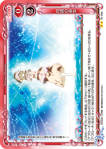 | このカードをプレイする場合、以下から1つ選択する。[アプローチ/自分]:自分の「月読 鎖々美」1枚は、ターン終了時まで+20/+20を得る。[アプローチ/自分]:キャラ1枚のAP/DPの値を、元に戻す。 | ||