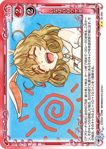 | [アプローチ/両方]:自分の「月読 鎖々美」1枚は、ターン終了時まで-20/-20を得る。このターン、そのキャラが退場した場合、自分の捨て札置き場にあるそのキャラを休息状態で場に出す。その場合、そのキャラの上に+10/+10コインを1個乗せる。 | ||