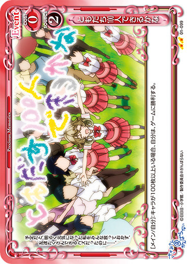 | [メイン/自分]:キャラが100枚以上いる場合、自分は、ゲームに勝利する。 | ||