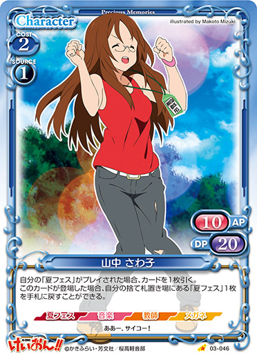 | 自分の「夏フェス」がプレイされた場合、カードを1枚引く。このカードが登場した場合、自分の捨て札置き場にある「夏フェス」1枚を手札に戻すことができる。 | ||