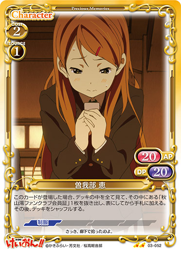 | このカードが登場した場合、デッキの中を全て見て、その中にある「秋山澪ファンクラブ会員証」1枚を抜き出し、表にしてから手札に加える。その後、デッキをシャッフルする。 | ||