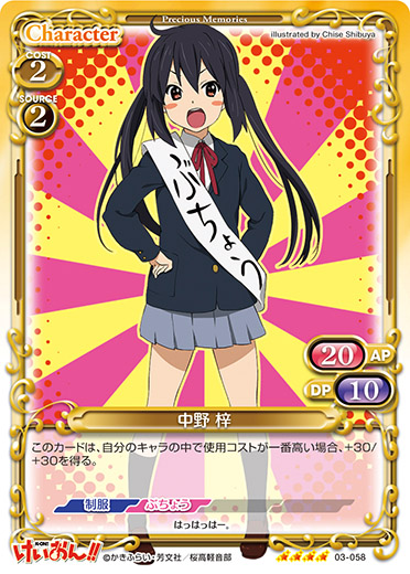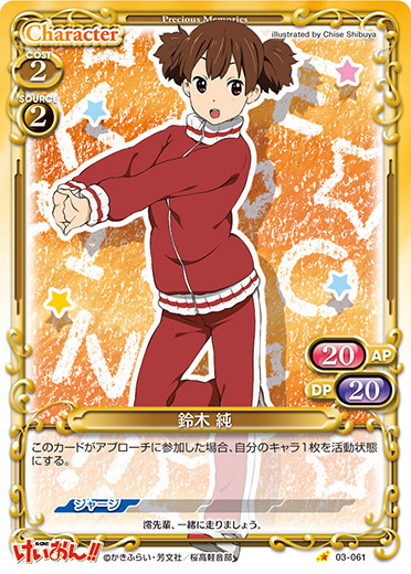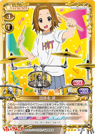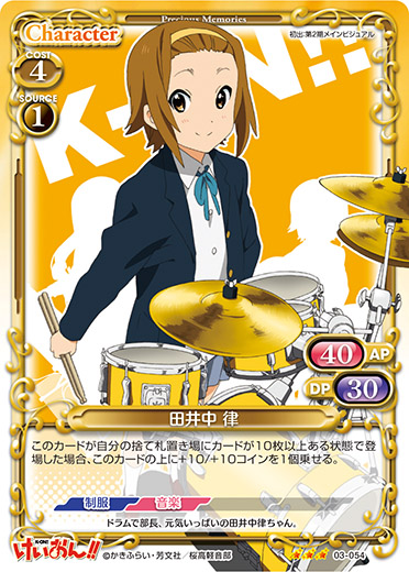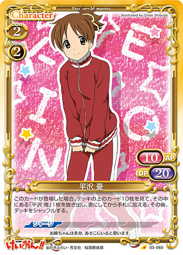 | このカードが登場した場合、デッキの上のカード10枚を見て、その中にある「平沢 唯」1枚を抜き出し、表にしてから手札に加える。その後、デッキをシャッフルする。 | ||