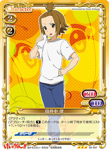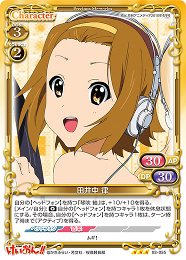| 自分の【ヘッドフォン】を持つ「琴吹 紬」は、+10/+10を得る。 [メイン/自分]:《0》自分の【ヘッドフォン】を持つキャラ1枚を休息状態にする。その場合、自分の【ヘッドフォン】を持つキャラ1枚は、ターン終了時まで〔アクティブ〕を得る。 | ||