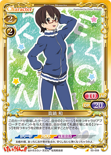 | このカードが登場したターンに、自分の【ジャージ】を持つキャラがアプローチでポイントを与えた場合、自分の捨て札置き場にある【ジャージ】を持つキャラを2枚まで手札に戻すことができる。 | ||