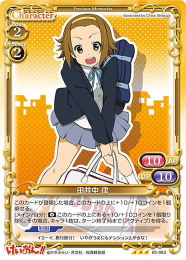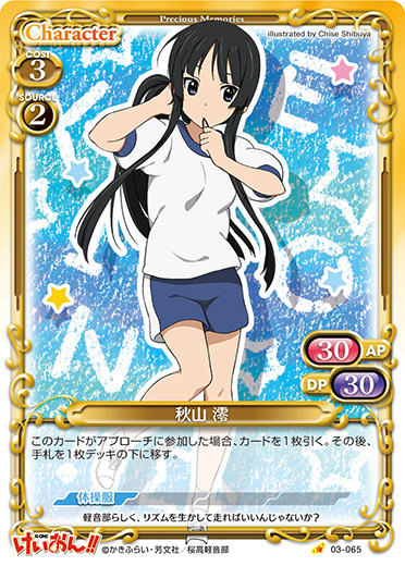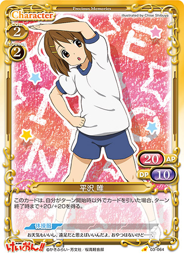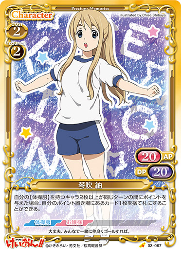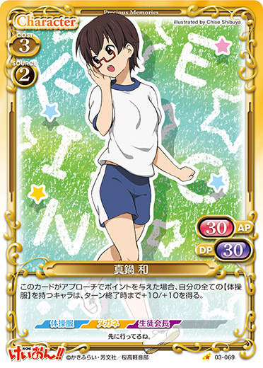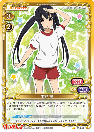 | このカードがアプローチに参加した場合、このカード以外の自分の【体操服】を持つキャラ1枚は、ターン終了時まで〔アクティブ〕、+10/+10を得る。 | ||