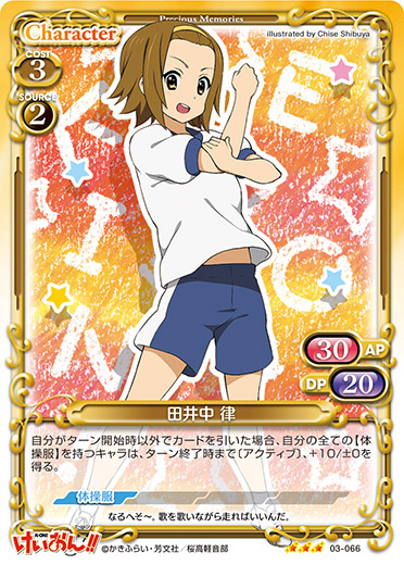 | このカードがアプローチでポイントを与えた場合、自分の全ての【体操服】を持つキャラは、ターン終了時まで+10/+10を得る。 | ||