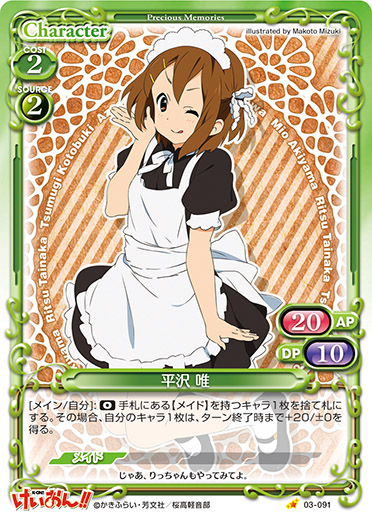 | [メイン/自分]:《0》手札にある【メイド】を持つキャラ1枚を捨て札にする。その場合、自分のキャラ1枚は、ターン終了時まで+20/±0を得る。 | ||