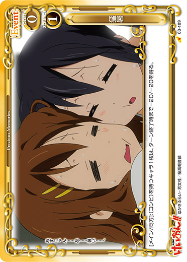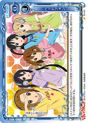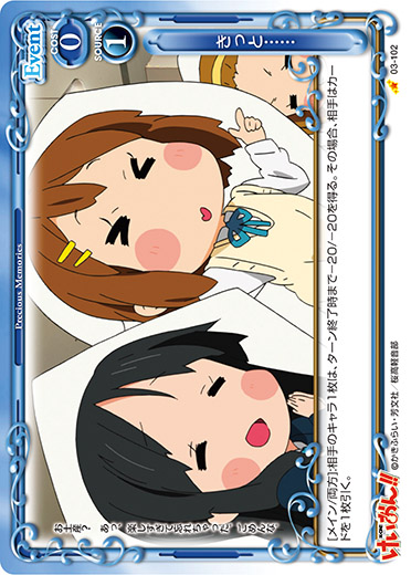 | [メイン/自分]:このターン、自分の「中野 梓」がアプローチに参加した場合、デッキの上のカード4枚を見て、任意の順番でデッキの上に戻す。その後、カードを1枚引く。 | ||