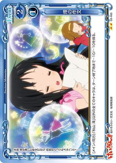 | [メイン/両方]:「秋山 澪」以外の全てのキャラは、ターン終了時まで-10/-10を得る。 | ||