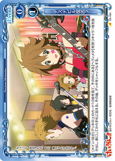 | [メイン/自分]:デッキの上のカード10枚を見て、その中にある【ヘヴィメタ】を持つキャラ1枚を抜き出し、表にしてから手札に加える。その後、デッキをシャッフルする。 | ||