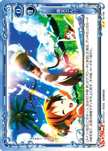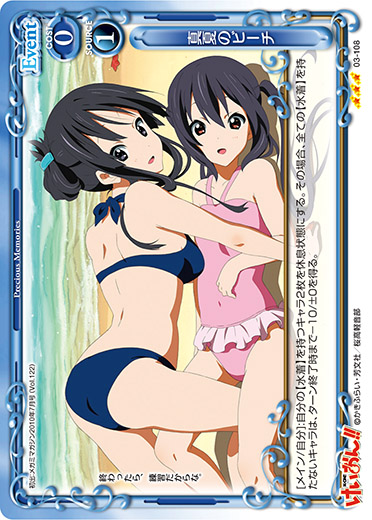| [メイン/自分]:自分の【水着】を持つキャラ2枚を休息状態にする。その場合、全ての【水着】を持たないキャラは、ターン終了時まで-10/±0を得る。 | ||