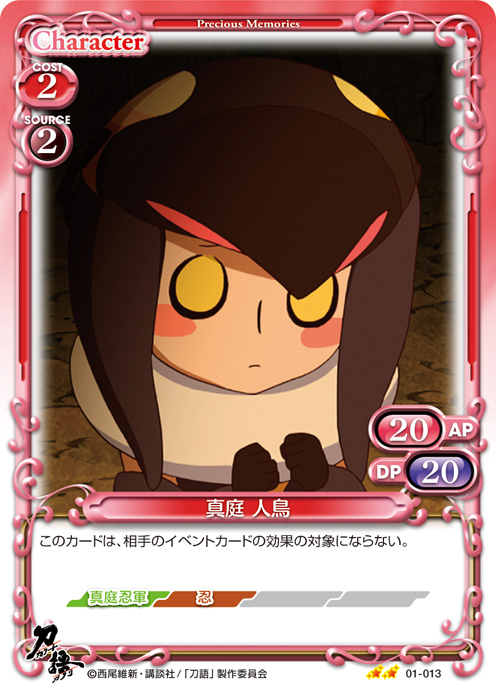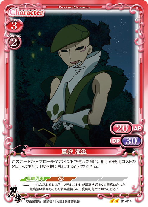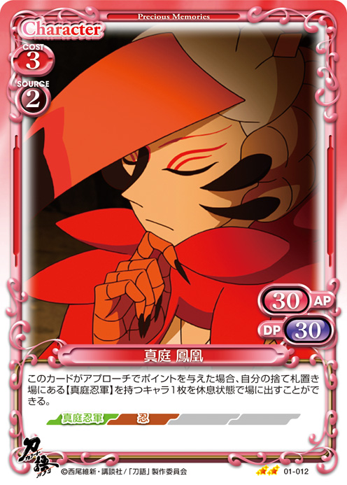 | このカードがアプローチでポイントを与えた場合、自分の捨て札置き場にある【真庭忍軍】を持つキャラ1枚を休息状態で場に出すことができる。 | ||