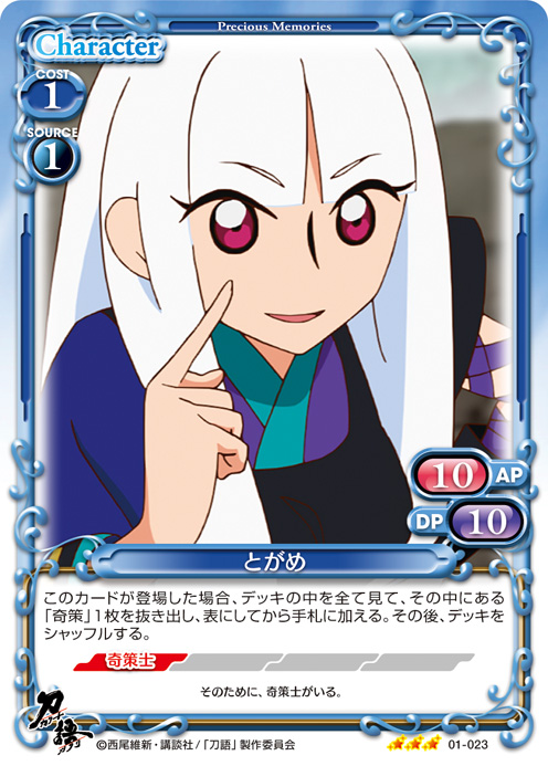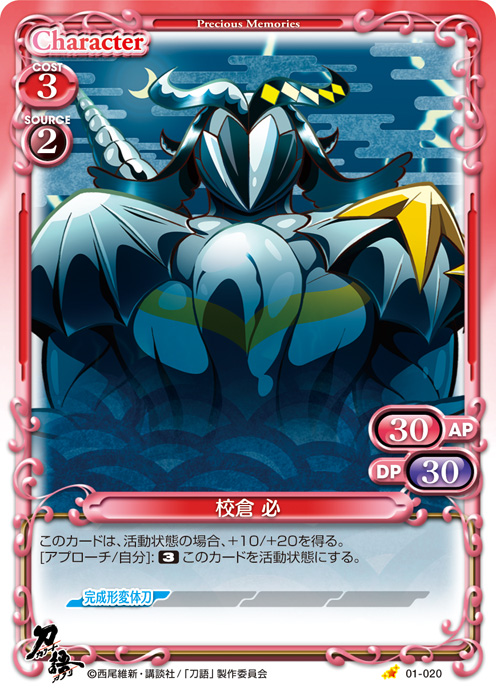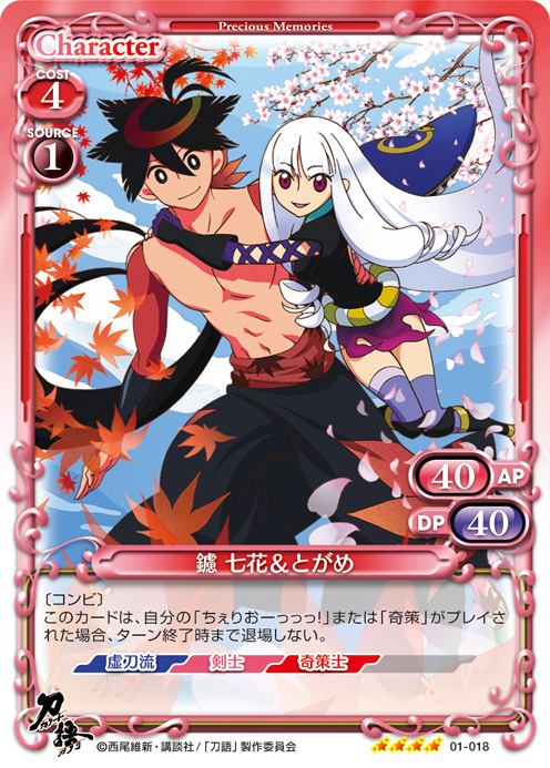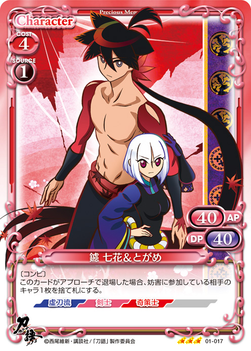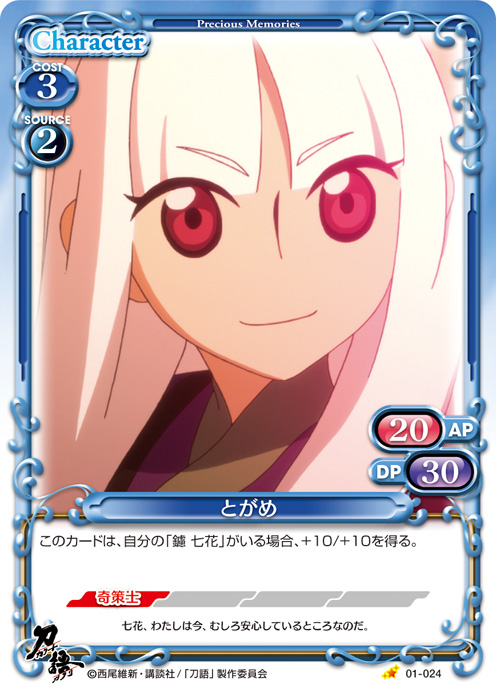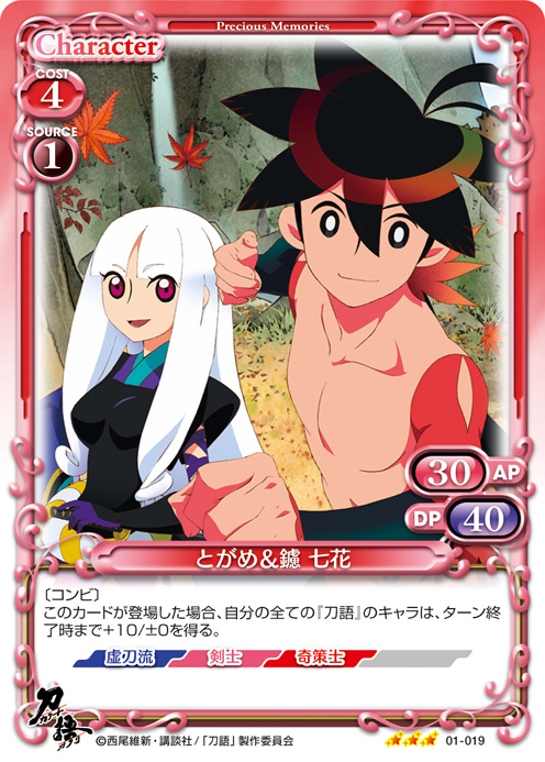| 〔コンビ〕 このカードが登場した場合、自分の全ての『刀語』のキャラは、ターン終了時まで+10/±0を得る。 | ||