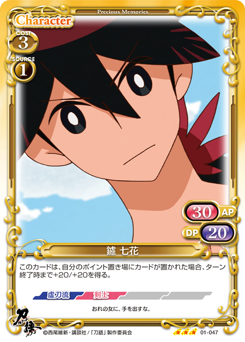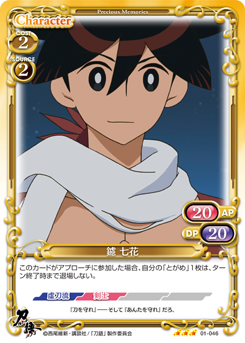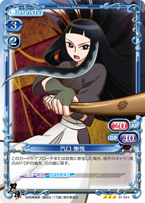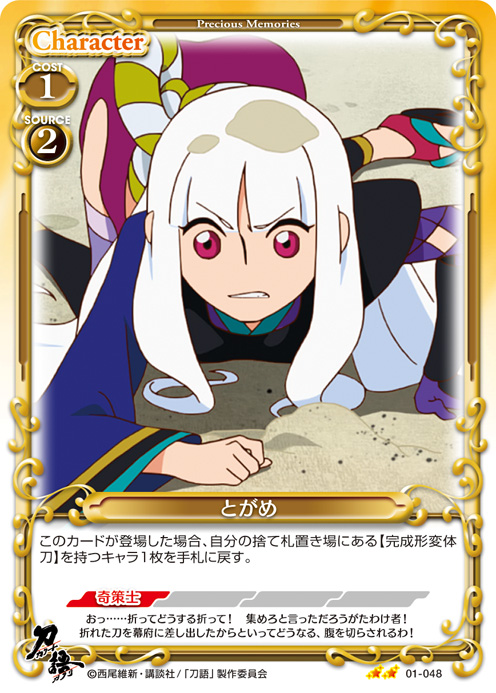 | このカードが登場した場合、自分の捨て札置き場にある【完成形変体刀】を持つキャラ1枚を手札に戻す。 | ||