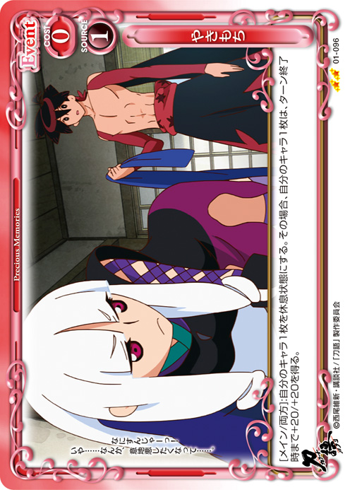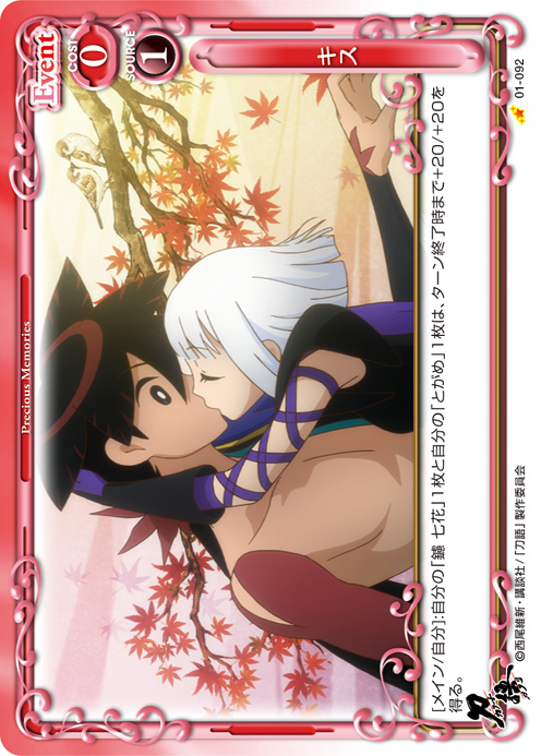 | [メイン/自分]:自分の「鑢 七花」1枚と自分の「とがめ」1枚は、ターン終了時まで+20/+20を得る。 | ||