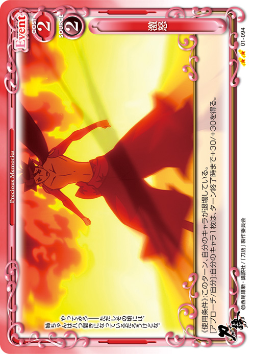 | 《使用条件》:このターン、自分のキャラが退場している。[アプローチ/自分]:自分のキャラ1枚は、ターン終了時まで+30/+30を得る。 | ||