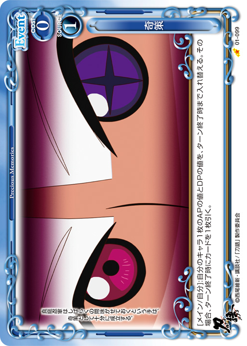 | [メイン/自分]:自分のキャラ1枚のAPの値とDPの値を、ターン終了時まで入れ替える。その場合、ターン終了時にカードを1枚引く。 | ||