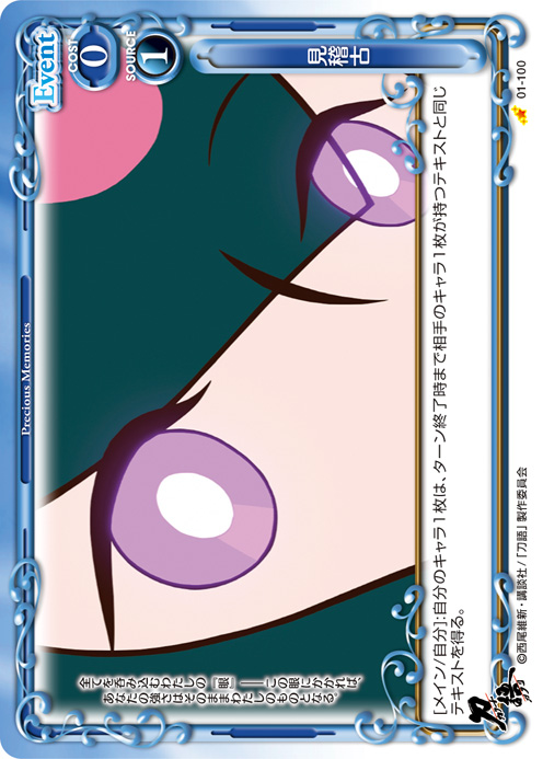 | [メイン/自分]:自分のキャラ1枚は、ターン終了時まで相手のキャラ1枚が持つテキストと同じテキストを得る。 | ||
