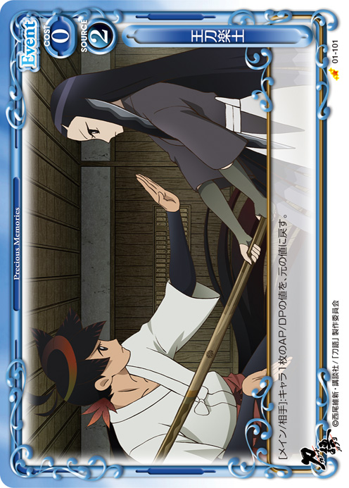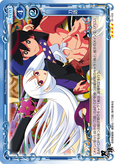 | [メイン/自分]:自分の『刀語』のAP/DPを持つ活動状態のキャラ1枚と、相手のメインエリアにいるAP/DPを持つ活動状態のキャラ1枚は、退場判定を行う。 | ||