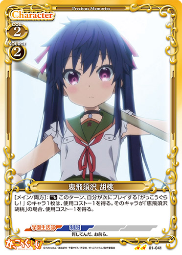 | このカードが登場した場合、このターン、自分が次にプレイする「恵飛須沢 胡桃」1枚は、使用コスト-4を得る。 | ||
