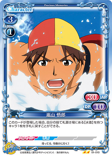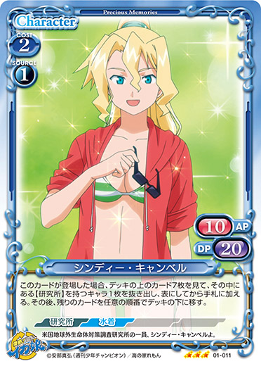 | このカードが登場した場合、自分の捨て札置き場にある【水着】を持つキャラ1枚を手札に戻すことができる。 | ||