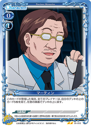| このカードが登場した場合、デッキの上のカード7枚を見て、その中にある【研究所】を持つキャラ1枚を抜き出し、表にしてから手札に加える。その後、残りのカードを任意の順番でデッキの下に移す。 | ||