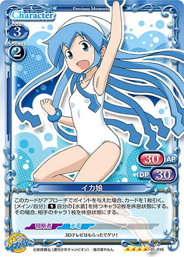 | このカードがアプローチでポイントを与えた場合、自分の捨て札置き場にある【水着】を持つキャラ1枚を手札に戻すことができる。[メイン/相手]:《休》自分の【水着】を持つキャラ2枚を休息状態にする。その場合、ターン終了時にカードを1枚引く。 | ||