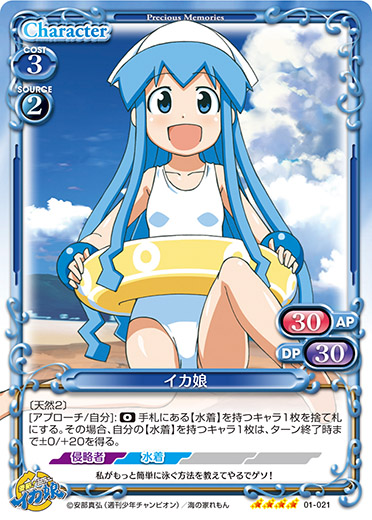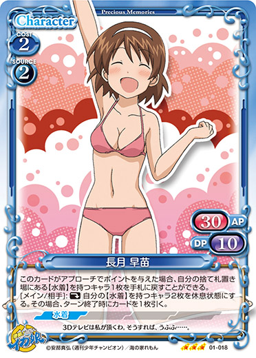 | 〔天然2〕[アプローチ/自分]:《0》手札にある【水着】を持つキャラ1枚を捨て札にする。その場合、自分の【水着】を持つキャラ1枚は、ターン終了時まで±0/+20を得る。 | ||