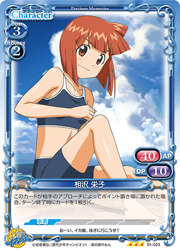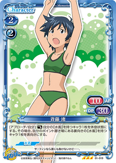 | [アプローチ/自分]:《休》自分の【水着】を持つキャラ1枚を休息状態にする。その場合、自分のポイント置き場にある裏向きの【水着】を持つキャラ1枚を表向きにする。 | ||