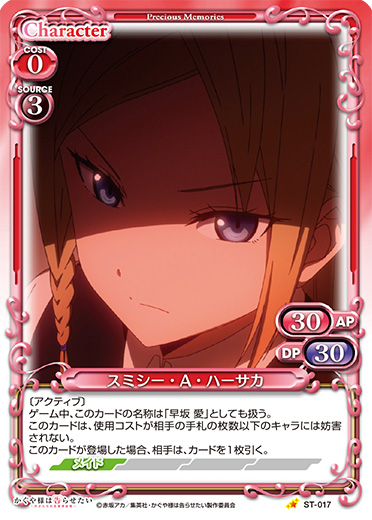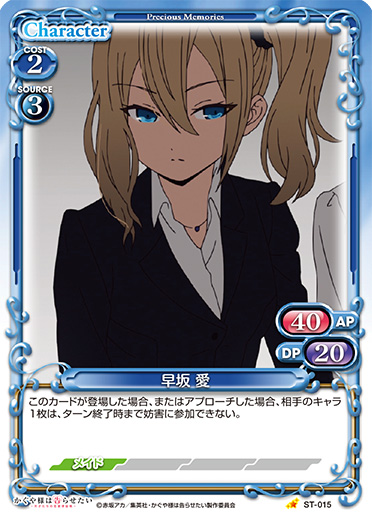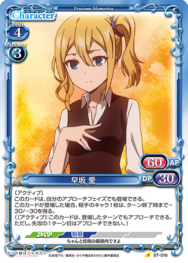 | 〔アクティブ〕ゲーム中、このカードの名称は「早坂 愛」としても扱う。このカードは、使用コストが相手の手札の枚数以下のキャラには妨害されない。このカードが登場した場合、相手は、カードを1枚引く。 | ||