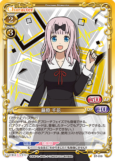 | 〔天然2〕自分のキャラが登場した場合、このカードは、ターン終了時まで〔天然+3〕を得る。(〔天然2〕:このカードのアプローチは、使用コストが2以下のキャラには妨害されない。) | ||