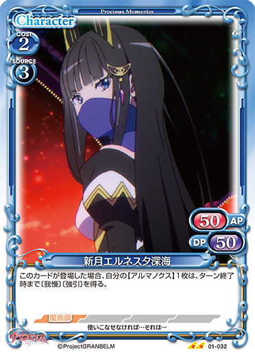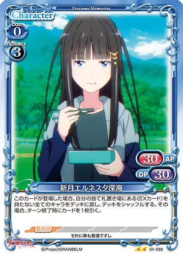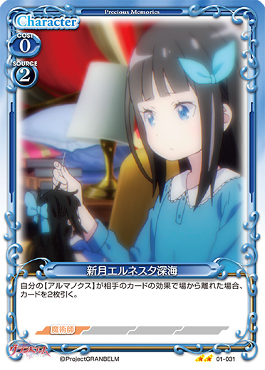 | このカードが登場した場合、このターン、自分が次にプレイする「新月エルネスタ深海」1枚は、使用コスト-3を得る。このカードが退場した場合、自分の「新月エルネスタ深海」または「ヴィオラカッツェ」1枚を活動状態にできる。 | ||