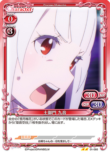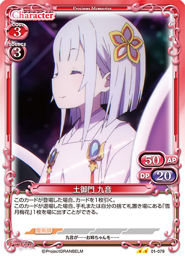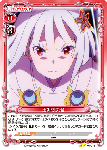 | このカードが登場した場合、自分の「土御門 九音」または「雪月梅花」1枚は、ターン終了時まで+20/+20を得るとともに、ターン終了時に活動状態になる。[メイン/相手]:《1》カードを1枚引く。その場合、このカードを捨て札にする。 | ||