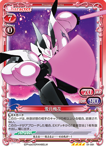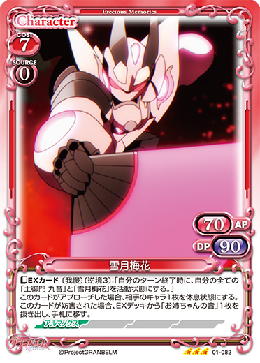 | 〔EXカード〕〔我慢〕〔逆境3〕:「自分のターン終了時に、自分の全ての「土御門 九音」と「雪月梅花」を活動状態にする。」このカードがアプローチした場合、相手のキャラ1枚を休息状態にする。このカードが妨害された場合、EXデッキから「お姉ちゃんの音」1枚を抜き出し、手札に移す。 | ||