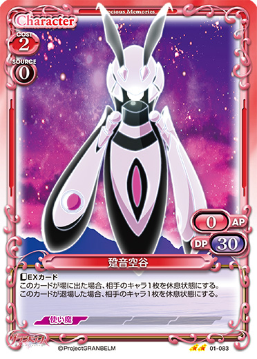 | 〔EXカード〕このカードは、休息状態の相手のキャラが5枚以上いる場合、妨害されない。このカードがアプローチした場合、EXデッキから「跫音空谷」1枚を抜き出し、場に出す。 | ||