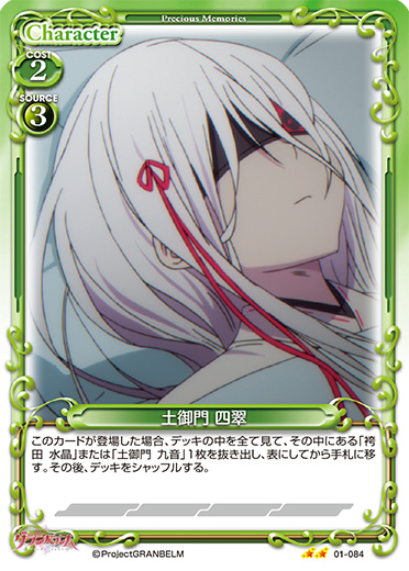| このカードが登場した場合、デッキの中を全て見て、その中にある「袴田 水晶」または「土御門 九音」1枚を抜き出し、表にしてから手札に移す。その後、デッキをシャッフルする。 | ||