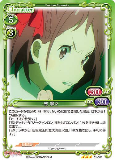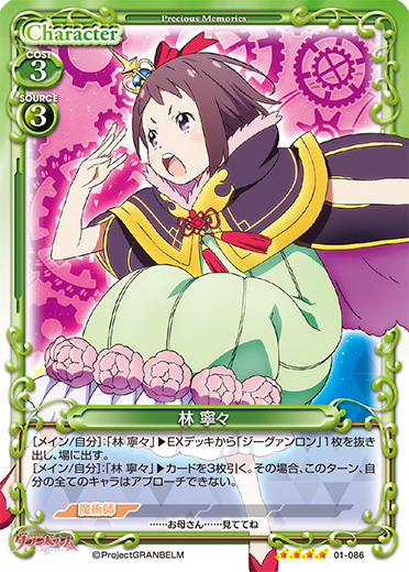 | このカードが登場した場合、自分のポイント置き場にあるカードを2枚まで表向きにできる。[メイン/自分]:《0》EXデッキから「ジーグァンロン」1枚を抜き出し、場に出す。その場合、このカードを捨て札にする。このテキストは、自分の「林 寧々」が3枚以上いる場合にのみ使用できる。 | ||