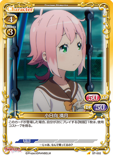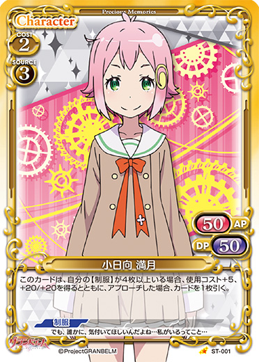 | このカードは、自分の【制服】が4枚以上いる場合、使用コスト+5、+20/+20を得るとともに、アプローチした場合、カードを1枚引く。 | ||