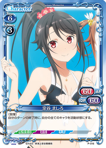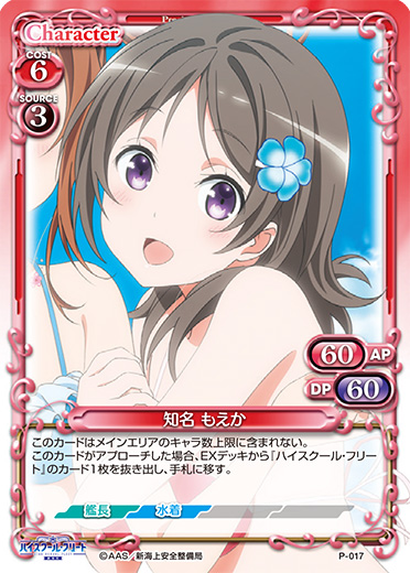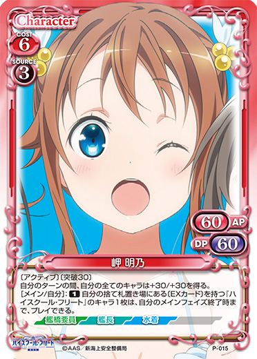 | このカードはメインエリアのキャラ数上限に含まれない。このカードがアプローチした場合、EXデッキから『ハイスクール・フリート』のカード1枚を抜き出し、手札に移す。 | ||