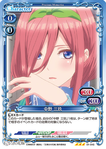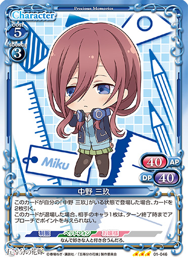 | このカードが自分の「中野 三玖」がいる状態で登場した場合、カードを2枚引く。このカードが退場した場合、相手のキャラ1枚は、ターン終了時までアプローチでポイントを与えられない。 | ||