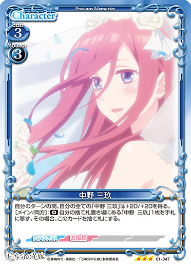 | このカードは、自分の捨て札置き場にカードが10枚以上ある場合、+20/+20を得る。このカードのアプローチで相手のキャラが退場した場合、自分の捨て札置き場にある『五等分の花嫁』のカード1枚を手札に移す。 | ||
