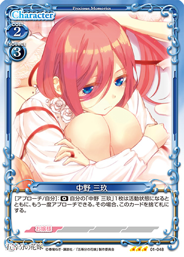 | [アプローチ/自分]:《0》自分の「中野 三玖」1枚は活動状態になるとともに、もう一度アプローチできる。その場合、このカードを捨て札にする。 | ||