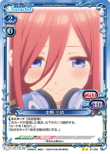 | 自分のターンの間、自分の全ての「中野 三玖」は+20/+20を得る。[メイン/両方]:《0》自分の捨て札置き場にある「中野 三玖」1枚を手札に移す。その場合、このカードを捨て札にする。 | ||