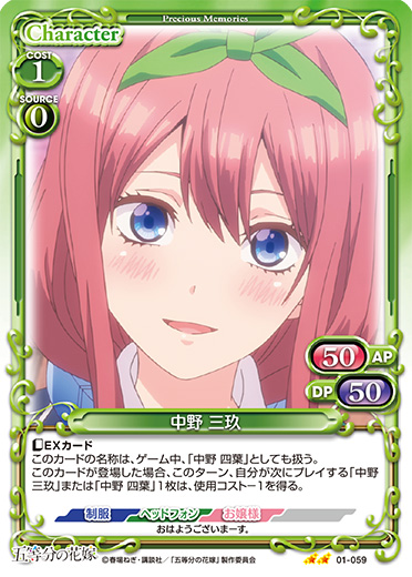 | 〔EXカード〕このカードの名称は、ゲーム中、「中野 四葉」としても扱う。このカードが登場した場合、このターン、自分が次にプレイする「中野 三玖」または「中野 四葉」1枚は、使用コスト-1を得る。 | ||