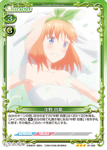 | 自分のターンの間、自分の全ての「中野 四葉」は+20/+20を得る。[メイン/両方]:《0》自分の捨て札置き場にある「中野 四葉」1枚を手札に移す。その場合、このカードを捨て札にする。 | ||