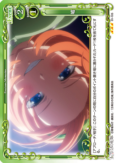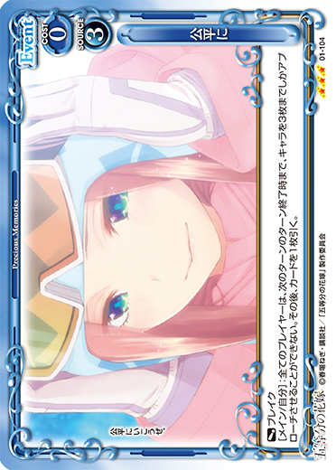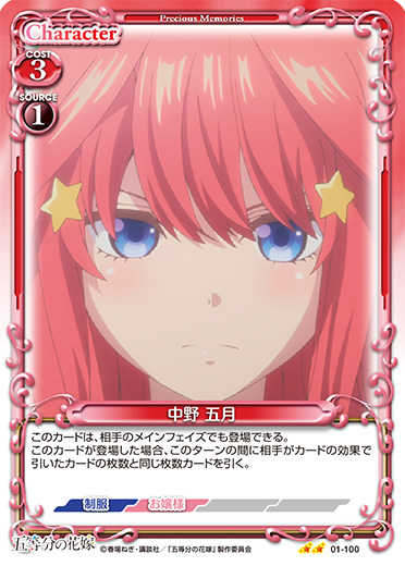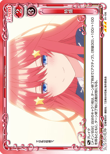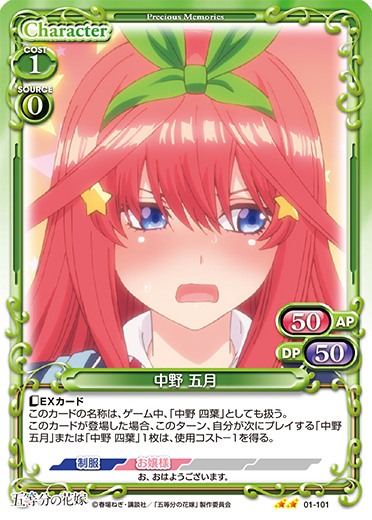 | 〔EXカード〕このカードの名称は、ゲーム中、「中野 四葉」としても扱う。このカードが登場した場合、このターン、自分が次にプレイする「中野 五月」または「中野 四葉」1枚は、使用コスト-1を得る。 | ||