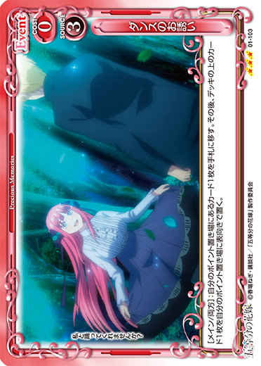 | [メイン/両方]:自分のポイント置き場にあるカード1枚を手札に移す。その後、デッキの上のカード1枚を自分のポイント置き場に表向きで置く。 | ||