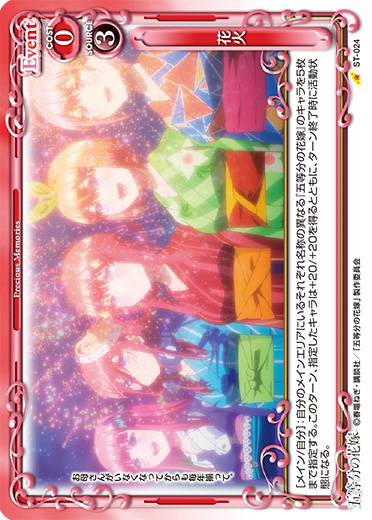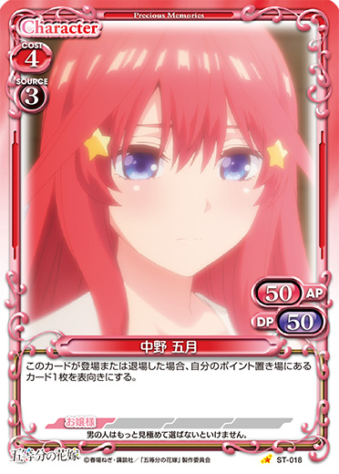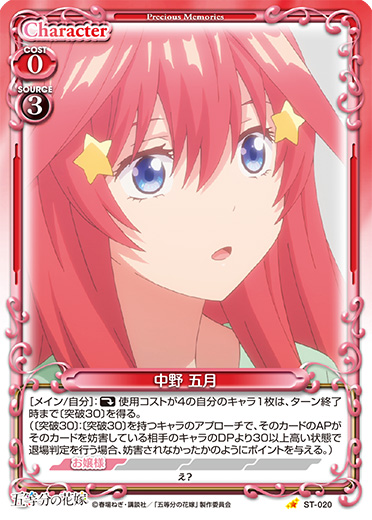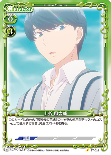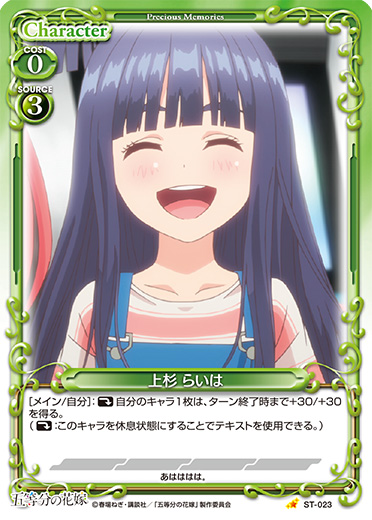 | このカードは自分の『五等分の花嫁』のキャラの使用型テキストのコストとして使用する場合、発生コスト+2を得る。 | ||