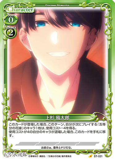 | このカードが登場した場合、このターン、自分が次にプレイする『五等分の花嫁』のキャラ1枚は、使用コスト-4を得る。使用コストが4の自分のキャラが退場した場合、このカードを手札に移す。 | ||